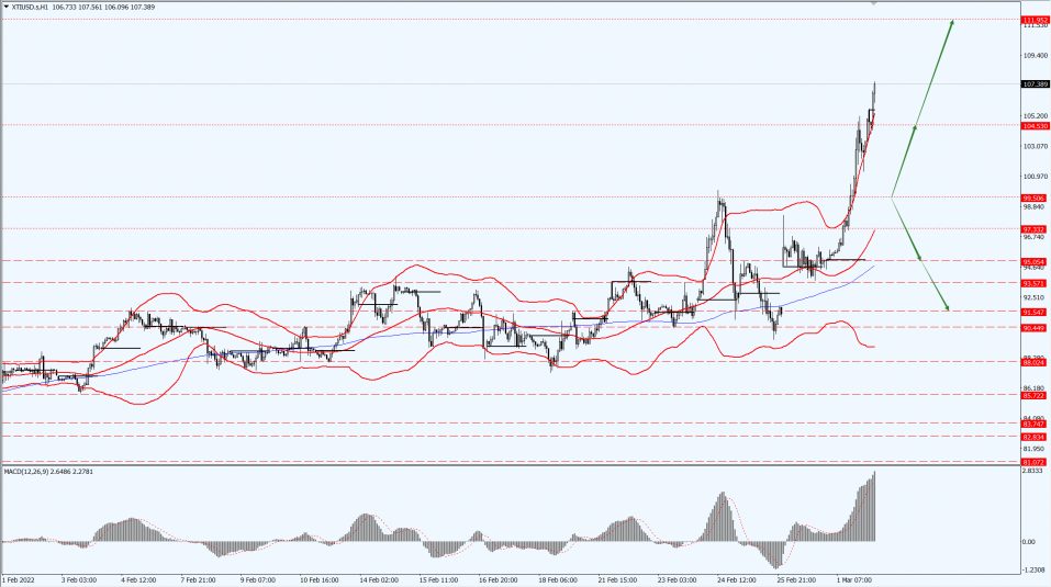 Oil prices focus on the 99.50-line today. If the oil price runs above the 99.50-line, then focus on the suppression of the 104.53 and 111.95 positions; if the oil price breaks below the 99.50-line, then pay attention to the support strength of the 95.05 and 91.54 positions.