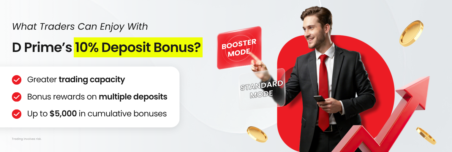 At D Prime, we offer a 10% Deposit Bonus to both new and existing clients, giving them extra margin and equity to support their trading activities. With this D Prime Deposit Bonus, clients can enjoy greater flexibility in choosing the assets they want to trade and in shaping their portfolios to better take advantage of global market opportunities.