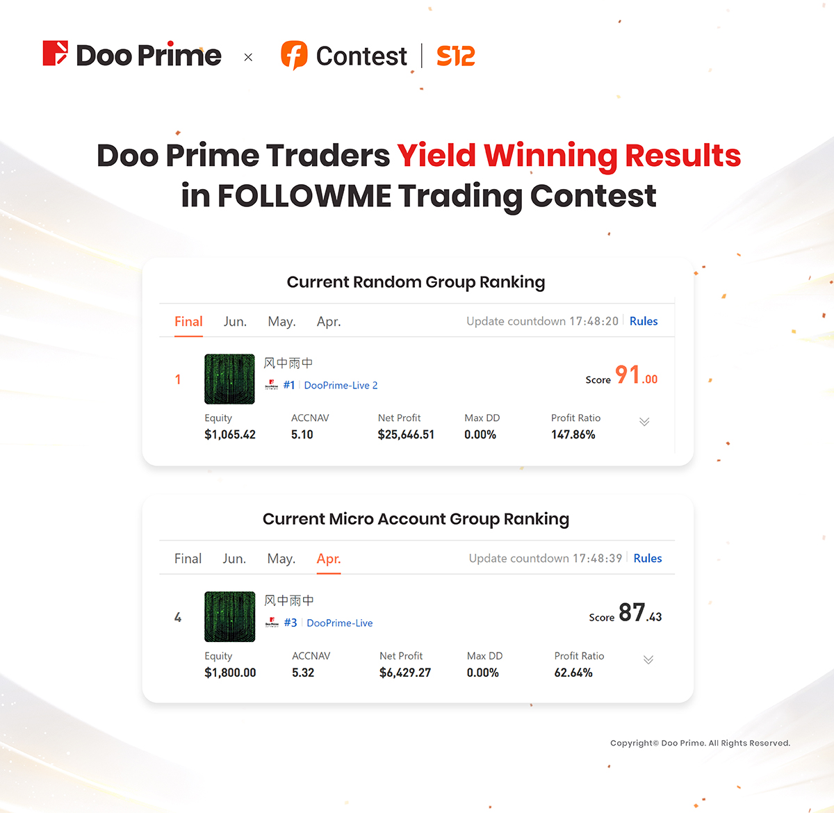 Doo Prime understands the importance of exchanging ideas through real competition in improving traders’ technical abilities. Hence, we continue to sponsor and participate in the FOLLOWME S12 Trading Contest, providing a great opportunity for global users to exchange and learn from each other. With the support of Doo Prime, as the Diamond Sponsor of the S12 trading contest, Doo Prime traders will have the opportunity to win additional prizes apart from the prize pool of over USD 55,000.