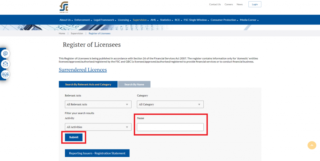 Step 3: You will be redirected to the “Register of Licensees” page. Please type “Doo Prime Mauritius Limited” into “Name” field and click on “Submit”.