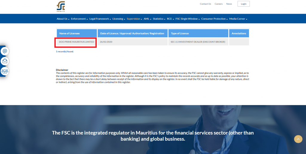 You may perform the verification through a search on Mauritius FSC Services Register. Let’s use Doo Prime Mauritius Limited as an example here.
