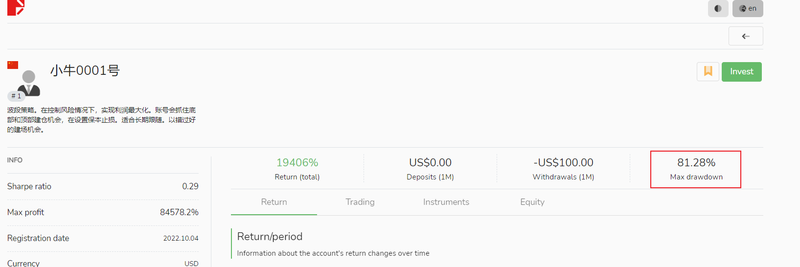 Despite starting with a relatively low capital, with the initial deposit being less than USD 100, “Xiaoniu No. 0001” (小牛0001号) trading signal provider has performed exceptionally well, with its asset value reaching a high of USD 4,739.52 at one point.