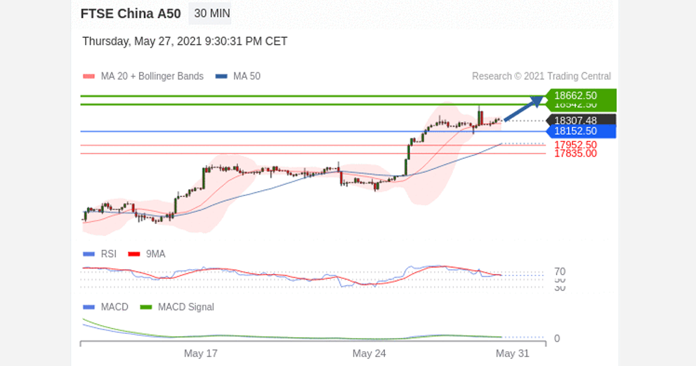 The RSI is above its neutrality area at 50. The MACD is below its signal line and positive. Prices could retrace in the short term. FTSE China A50 index is above its 20 and 50 period moving average (respectively at 18268.56 and 17977.87).
