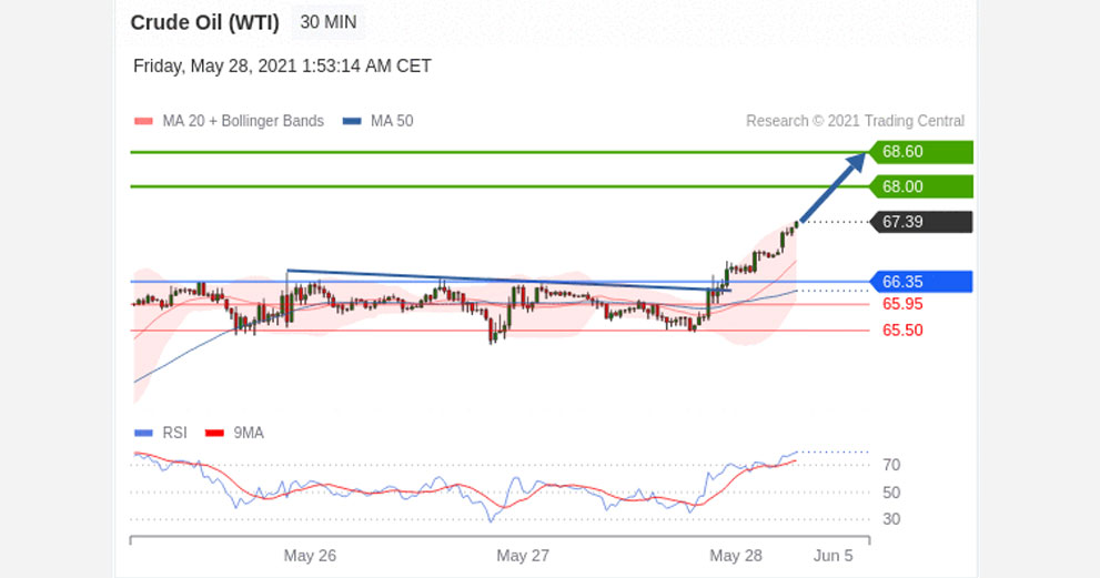 Long positions above 66.35 with targets at 68.00 & 68.60 in extension.