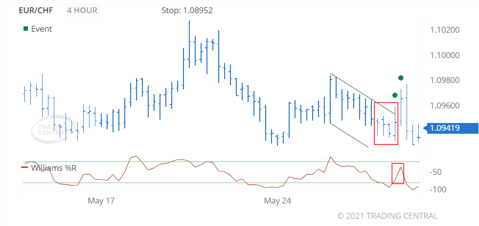 The Williams %R indicator triggered a bullish signal on 2021 May 27 at 13:00 GMT, having risen up out of oversold (-80 level) and continued on to cross above the -50 level.