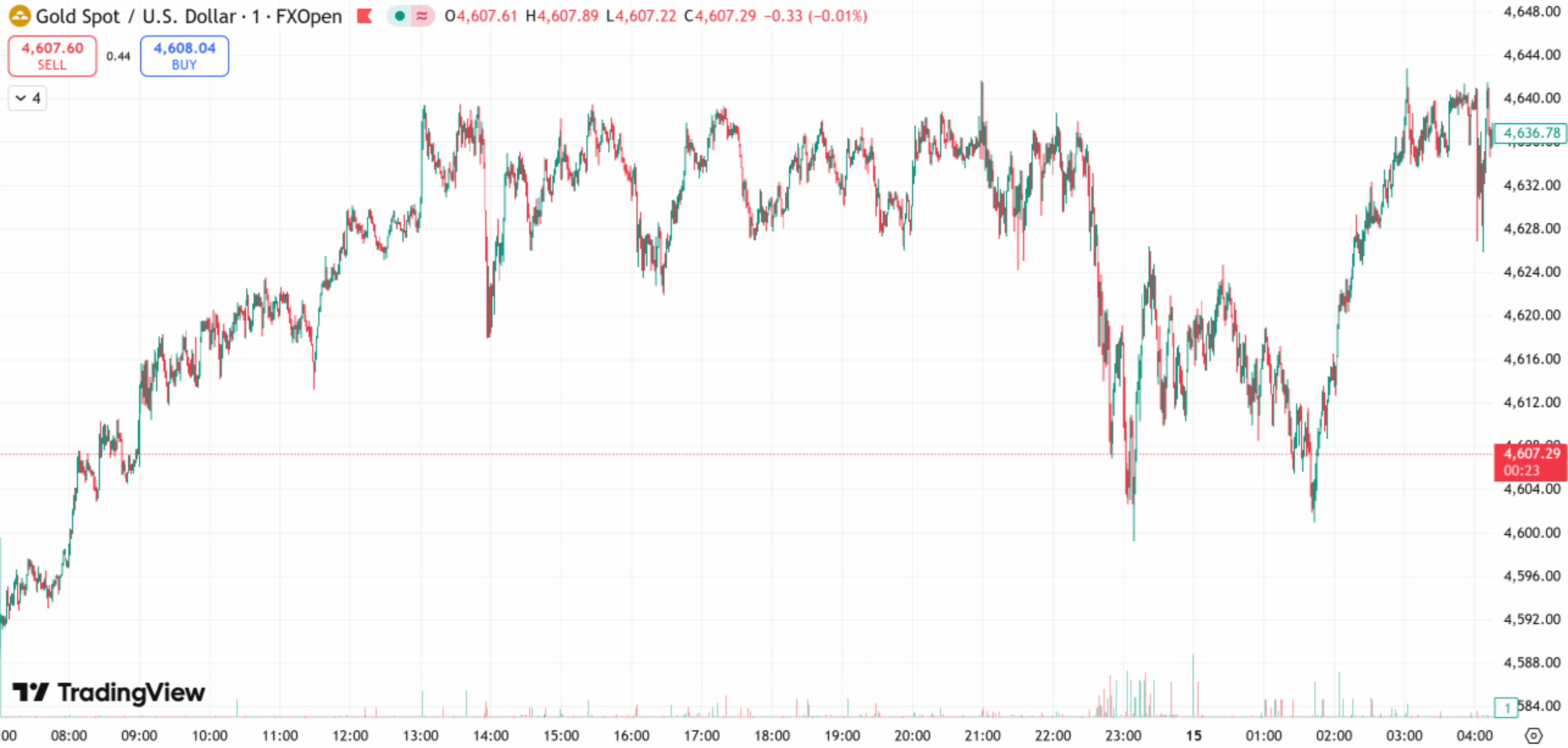 From a technical perspective, gold broke decisively above the 4,580–4,600 consolidation zone, briefly testing resistance near 4,640 before pulling back on profit-taking. Prices have now retreated toward the 4,590 area, a key technical support zone.