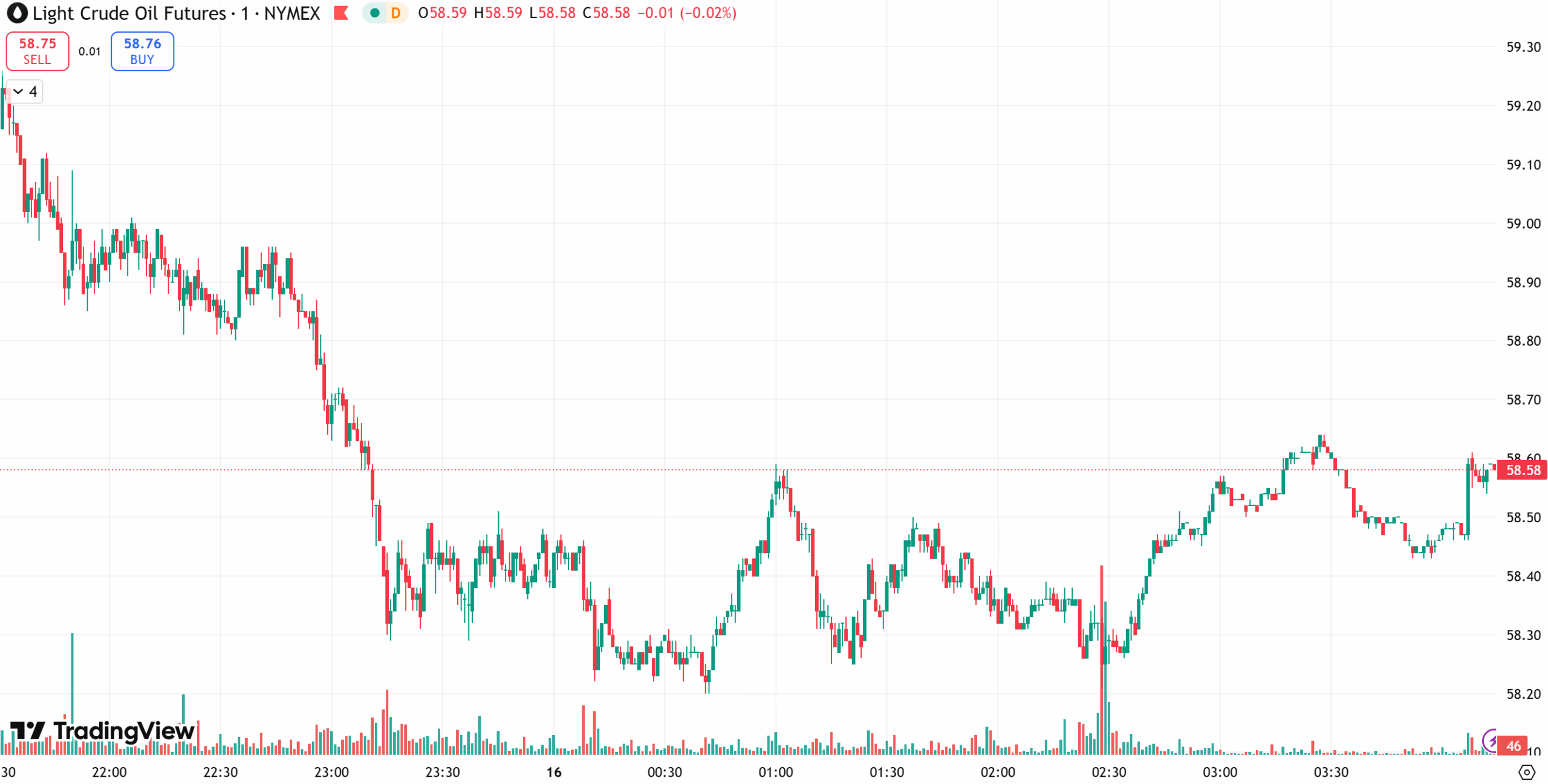 Technical outlook: On the daily chart, oil remains in a clear downtrend, with MACD lines diverging below zero and bearish momentum dominant. Short-term charts show continued weakness, as oil hit a new low near $57.30/bbl before a mild rebound. Moving averages remain downward-sloping, signaling persistent selling pressure.