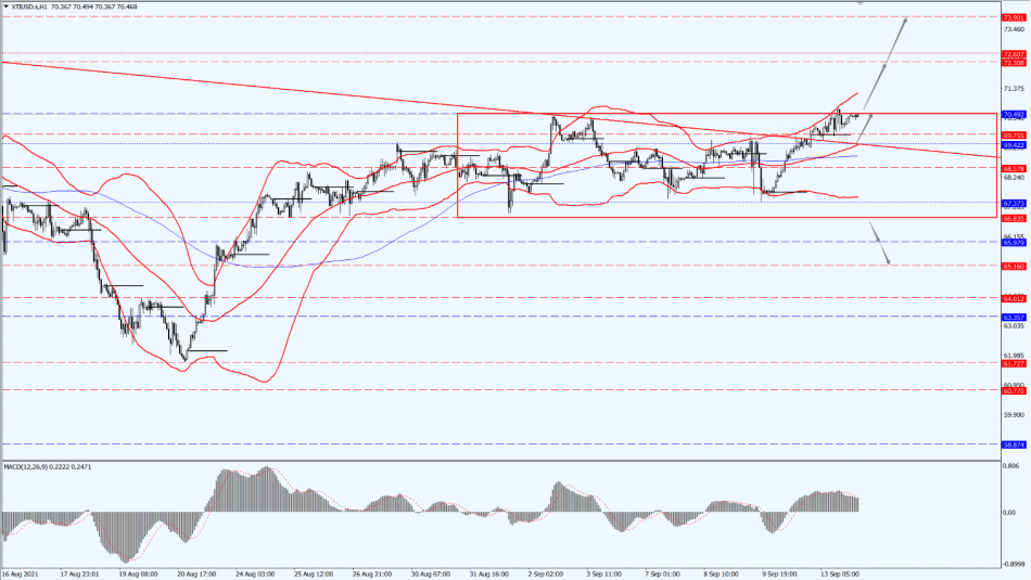 The oil price is currently at the upper boundary under the wide range of fluctuations. Today, we will pay attention to the breakthrough strength of the 70.49-line. If the oil price rises to the 70.49-line, it will open up a greater upside potential. On the lower end, pay attention to the support of the Bollinger Band Middle Rail. As long as the oil price runs stably above the Bollinger Band middle rail, maintain the idea of taking advantage of the trend.