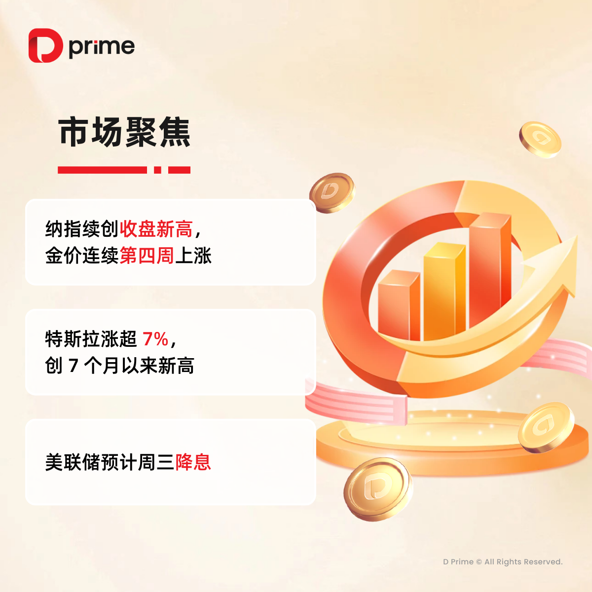 精选研报 | 美纳指续创收盘新高,金价连续第四周上涨。特斯拉涨超 7%,创 7 个月以来新高。美联储预计周三降息。