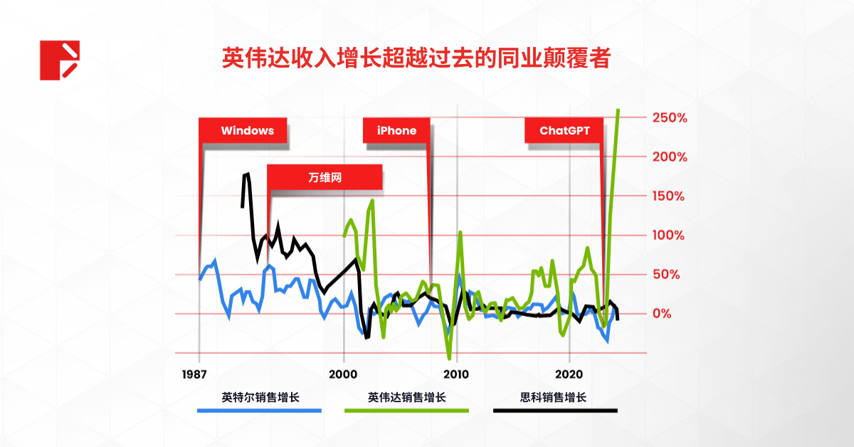 第三,英伟达的营收增长惊人!从历史上看,Windows、万维网和 iPhone 等关键技术创新推动了英特尔和思科的销售显着增长。然而,随着人工智能技术(尤其是ChatGPT)的崛起,英伟达的营收增长大幅飙升,增长率远远抛离从前的英特尔和思科。