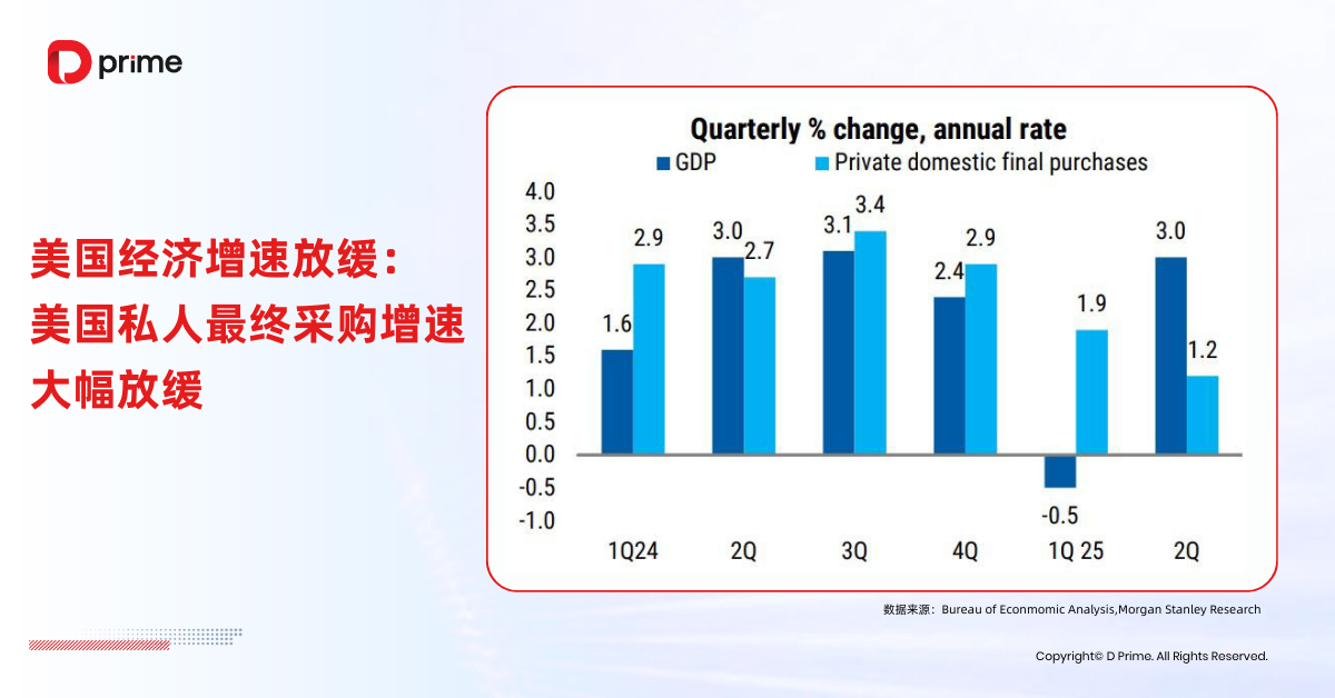 摩根士丹利首席美国经济学家 Michael Gapen 指出,美国 2025 年第二季度 3.0% 的 GDP 增速虽乍看强劲,但最终国内销售数据更能反映美国经济的内生动力。
