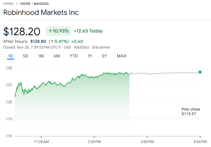 11 月 26 日至 27 日,线上券商 Robinhood(HOOD)周三股价大涨 10.93%,因公司宣布将扩大快速成长的预测市场业务版图。