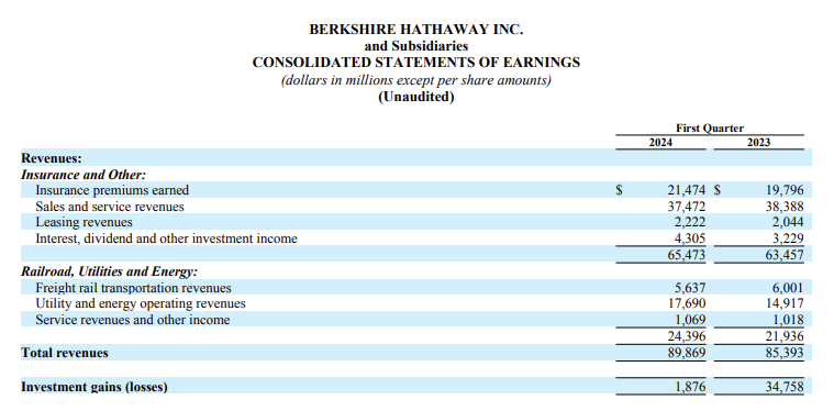 5 月 4 日,伯克希尔哈撒韦在股东大会问答环节开幕之前发布了 2024 年第一季度财报,得益于保费与铁路收入上涨,伯克希尔一季度营收同比增 5%,好于预期;净利润同比回落 64% 但好于市场担忧。