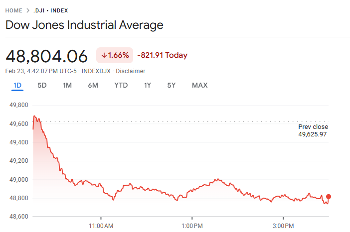 美股周一大幅下挫,道琼斯工业平均指数收跌逾 800 点,三大指数悉数走低。市场情绪受压,主因美国总统特朗普宣布将在最高法院否决其“对等关税”计划后进一步上调全球关税,加剧投资者对贸易摩擦与经济前景的担忧。