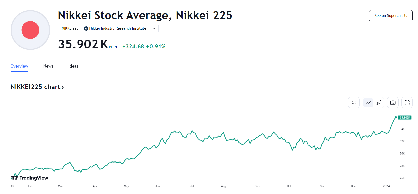 当地时间 1 月 15 日,在金融板块和航运板块的带动下,日经 225 指数连续 6 个交易日上涨,突破 36000 点,为 1990 年 2 月 22 日以来首次。今年以来日经 225 指数累计上涨了 6%,距离 1989 年创下的历史峰值 38915.9 点仅有 6% 的距离。