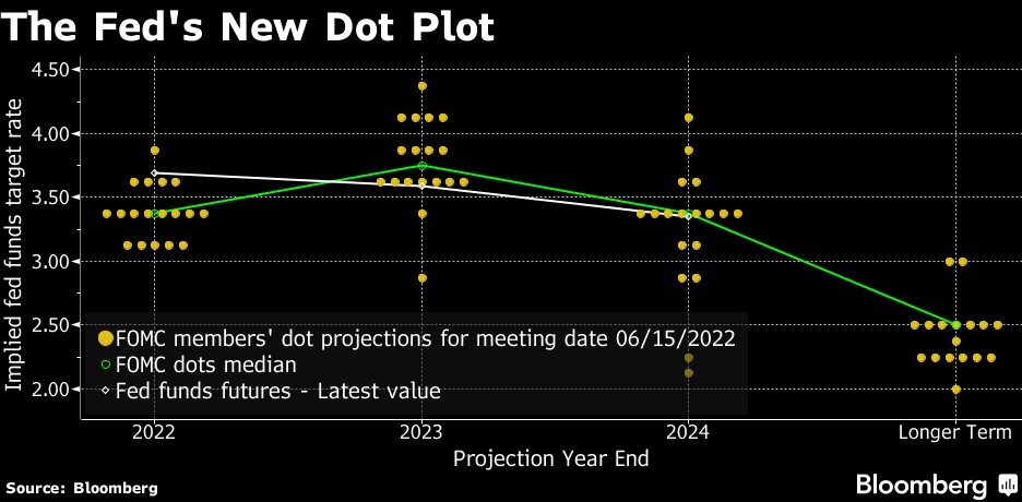 反映利率预期的点阵图分布看,18 个委员有 5 位预计年末利率目标区间为 3.00 – 3.25% ,即年底前仍有 150 个基点的空间,8 位预计将加息 175 个基点,支持加息 200 个基点和 225 个基点的分别有 4 位和 1 位委员。