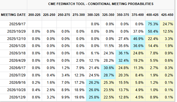 在 7 月就业数据意外疲软后,市场对 9 月降息预期升温。目前利率期货显示,9 月 7 日美联储降息 25 个基点的隐含概率为 75.3%,略低于前一日的 84%。分析师指出,鲍威尔如何解读近期“滞胀信号”与就业修正,将成为市场关键参考。