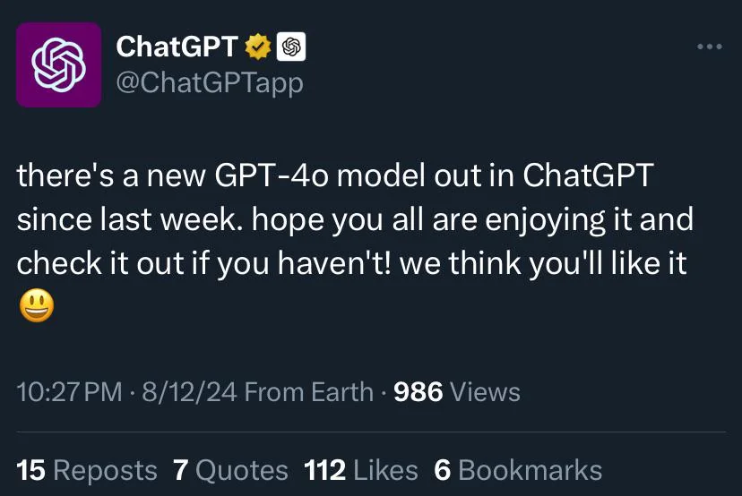 ChatGPT 在社交媒体 X 上发文称,聊天机器人家族的 GPT-4o 模型又迎来更新,目前免费用户也可以用这个模型,但有使用次数限制。