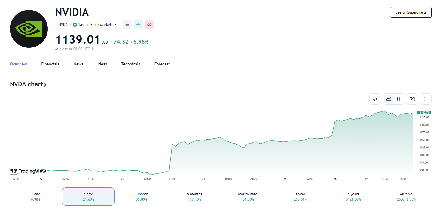 在英伟达公布强劲财报后,轻松实现了“三连涨”,累计涨幅约 20%。截至周二美股收盘,英伟达大涨近 7%,创下历史新高,市值达到约 2.8 万亿美元,较苹果仅差 1000 亿美元。在英伟达的带动下,纳指也连续第三个交易日创收盘历史新高。