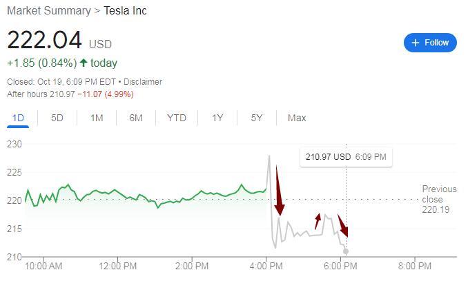 财报公布后,特斯拉股价盘后先迅速上涨,涨幅曾接近 3%,后很快跳水转跌,一度跌近 7%,此后跌幅收窄。
