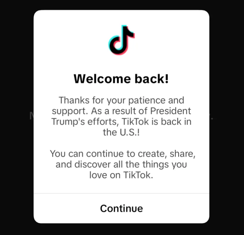 在打开 TikTok 应用后,系统自动弹窗通知称,“感谢您的耐心和支持,由于总统特朗普的努力,TikTok 重返美国了,你可以在 TikTok 上继续创作、分享和寻找你所爱的所有一切。”