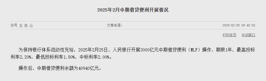 25 日,中国央行货币政策司公告称,为保持银行体系流动性充裕,开展 3000 亿元中期借贷便利(MLF)操作,期限 1 年,最高投标利率 2.20%,最低投标利率 1.80%,中标利率 2.00%。此次为中国央行连续第七个月缩量续作 MLF。此外,本月有 5000 亿元 MLF 到期,央行通过 MLF 净回笼 2000 亿元。