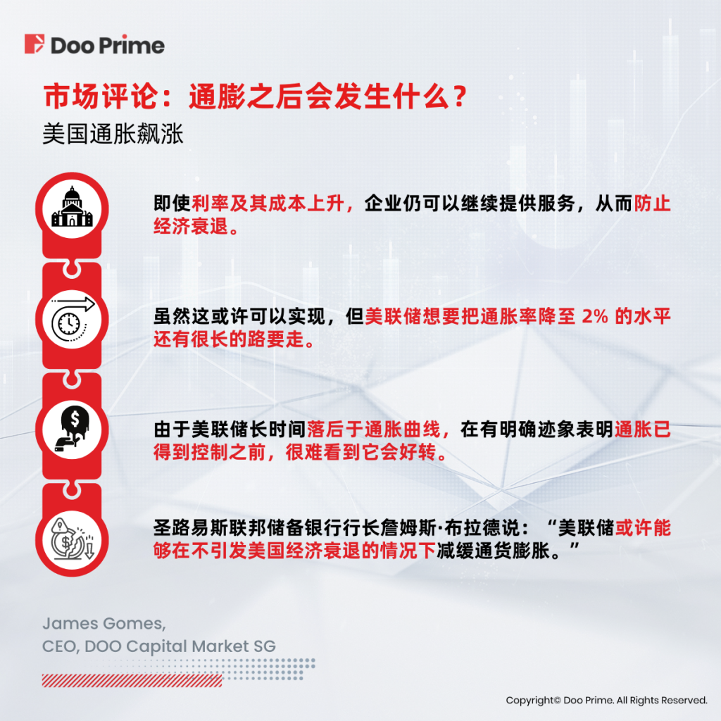 我们已经了解了美国高居不下的通货膨胀对市场走势有哪些影响,接下来就让我们关注一下,具备 30 年金融领域从业经验的 Doo Prime 分析师詹姆斯·戈麦斯(James Gomes)的专业分析与解读: