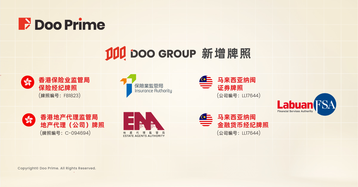 2022 年,Doo Prime 所属集团 Doo Group 已在全球 14 个国家地区成立了办事处,服务触及逾 40 个国家及地区,全年交易量超过 6,344 亿美元。截止目前 Doo Group 旗下的法律主体已受全球多家顶尖金融监管机构的严格监管,并持续不断地获得全球各地的权威监管牌照,如中国香港保险业监管局保险经纪牌照和马来西亚纳闽金融货币经纪牌照等。接受全球权威机构监管,让客户资金安全拥有了更可靠的保障。