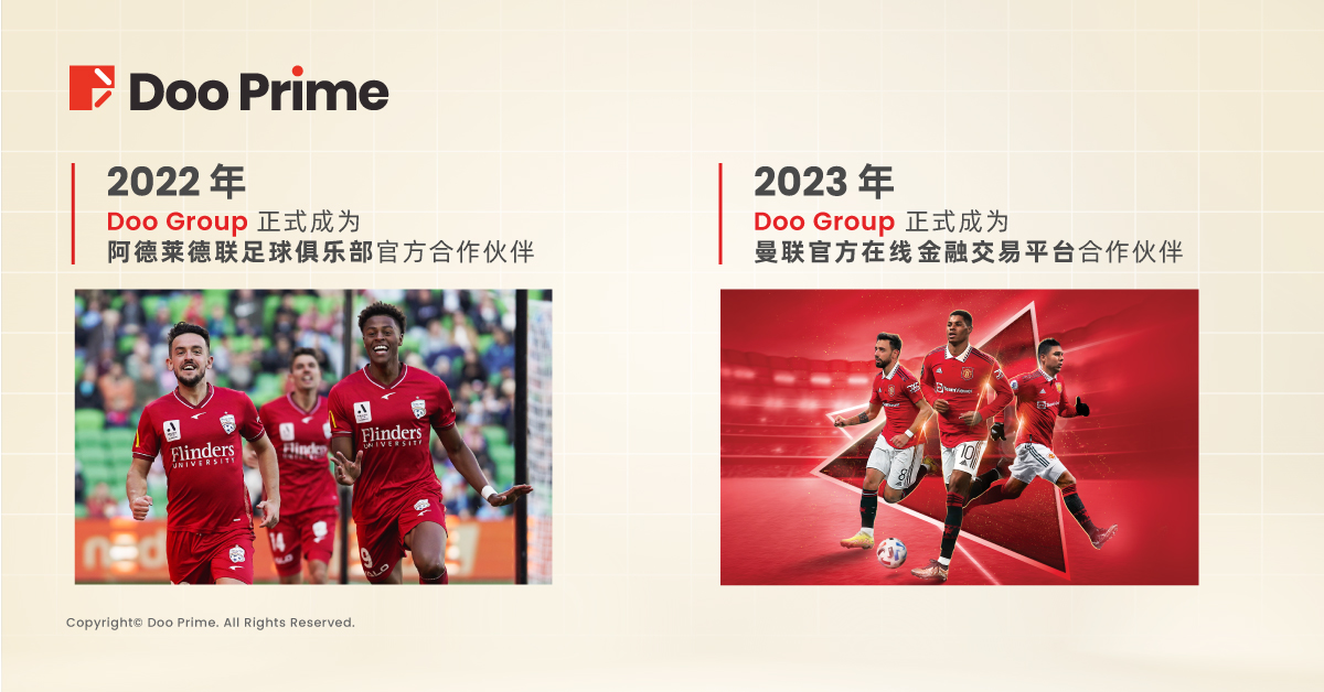不仅如此,Doo Group 也持续提升品牌实力,为广大客户带来多元化的品牌价值。2022 年 Doo Group 荣幸成为阿德莱德联足球俱乐部官方合作伙伴;2023 年开年,Doo Group 及其名下子品牌 Doo Prime、Doo Financial 已正式与享誉全球的曼联足球俱乐部展开合作。Doo Prime 依托集团实力,也逐渐收获更多国际认可,活跃在全球舞台上 。