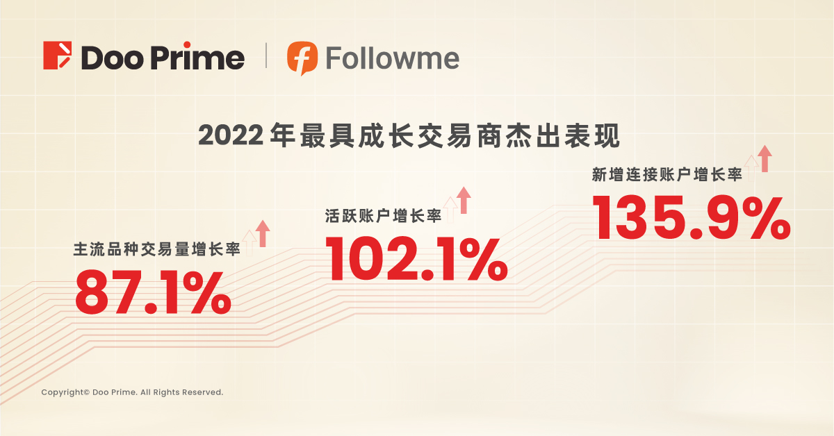 2022 年,Doo Prime 客户数量增长势头强劲,单在 FOLLOWME 平台中便达成了主流品种交易量增长 87.1%,活跃账户增长 102.1%,新增连接账户增长 135.9% ,Doo Prime 凭借十分出色的综合表现,斩获了 “2022 年最具成长交易商”的最高殊荣。