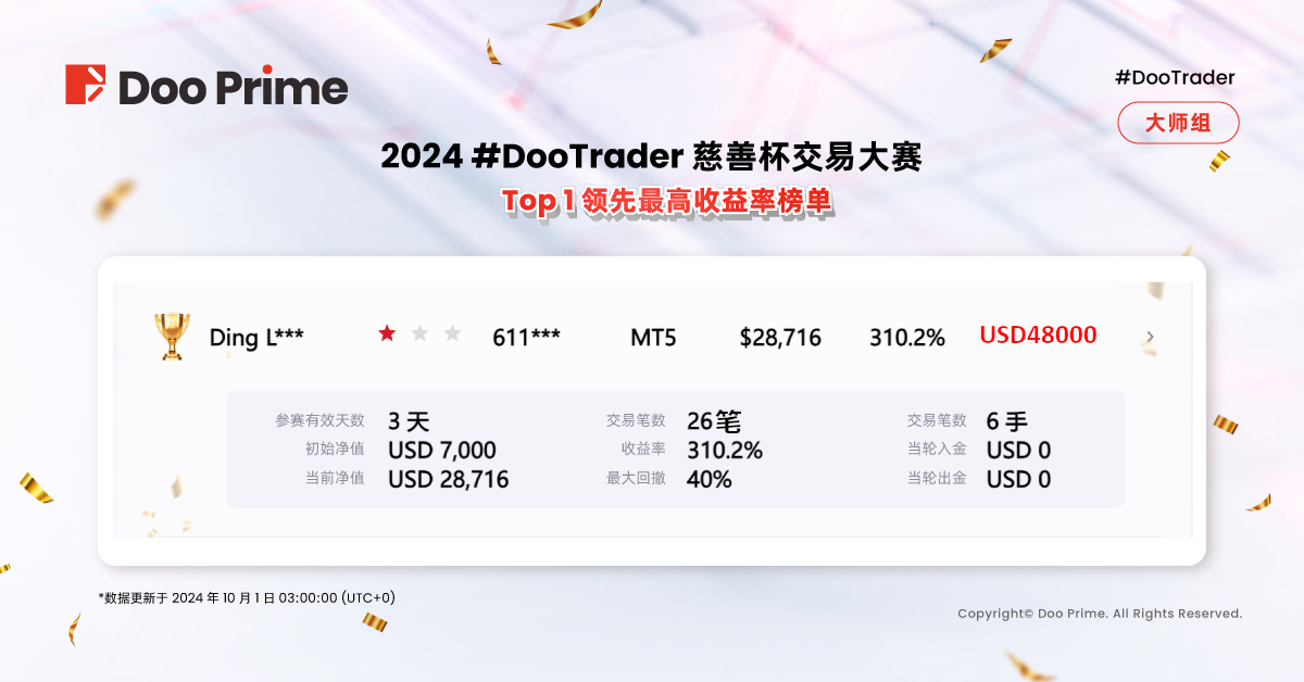 2024 #DooTrader 慈善杯 9 月交易大赛战况速览,选手仅凭两笔订单实现 310% 收益率?