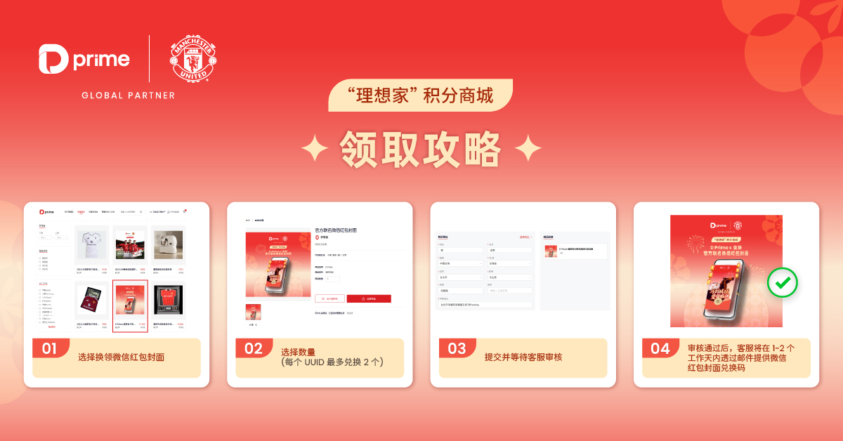 新春将至,好运开启!为感谢广大用户一直以来的陪伴和支持,D Prime “理想家” 积分商城重磅推出「 D Prime x 曼联 」新春限定联名微信红包封面,为你送上诚意满满的新年第一份礼!