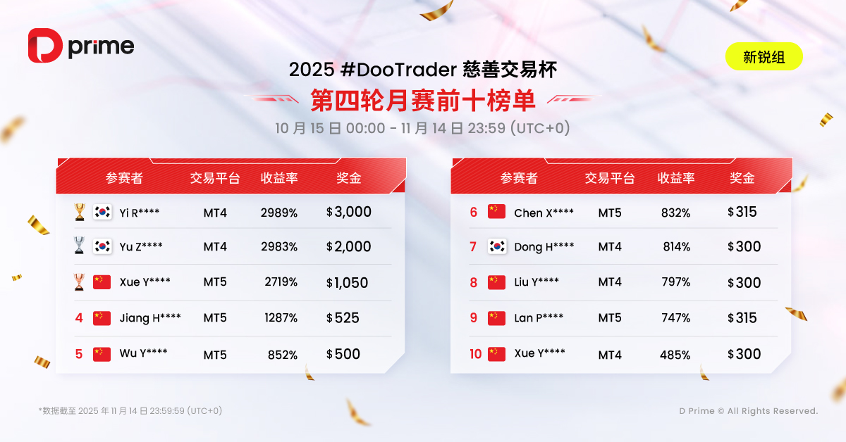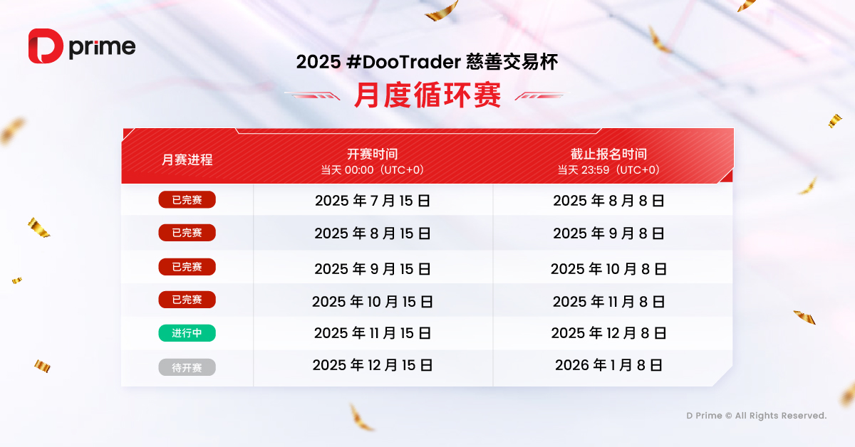 2025 年 D Prime #DooTrader 慈善交易杯第四轮月赛已于 11 月 14 日 23:59(UTC+0)顺利收官,赛果榜单火热揭晓!第五轮月赛紧随于 2025 年 11 月 15 日 00:00(UTC+0)开赛 —— 欢迎各路交易高手立刻报名,争夺线下决赛名额!