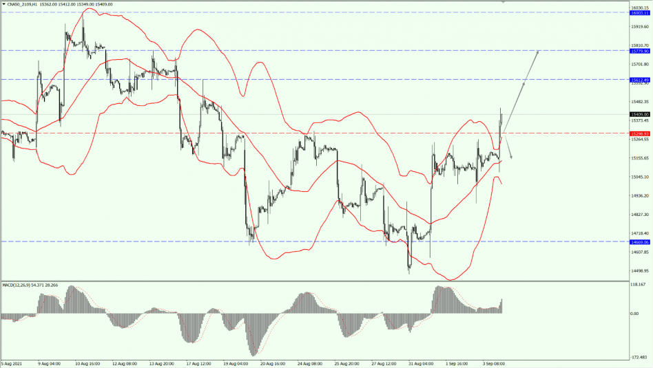 A50 broke through the 15298 line earlier today. As long as A50 runs stably above the 15298 line, pay attention to the suppression strength of the 15612 line. Then, focus on the support of the middle Bollinger Band below, as long as it does not fall below the middle Bollinger Band, it will maintain a bullish mode.