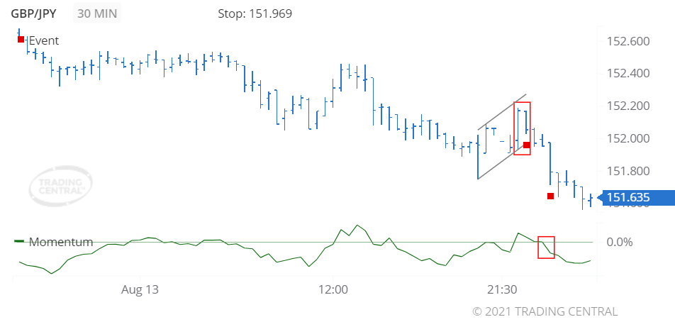 The Momentum oscillator crossed below 0 on 2021 Aug 16 at 00:30 GMT, thereby signaling a new accelerating downtrend.