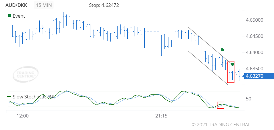 A bullish event triggered for Slow Stochastics on 2021 Aug 16 at 01:45 GMT when the %K line crossed above the %D line. The close prices are trading closer to the upper end of the recent high-low price range, which is associated with price increases.