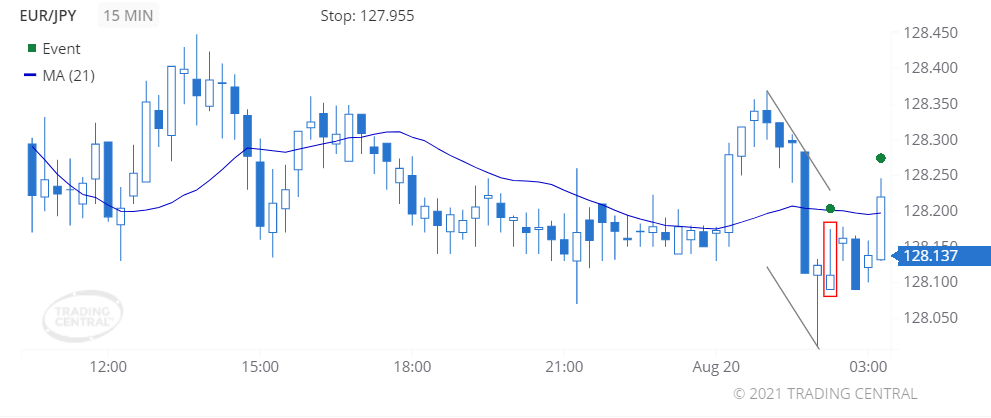 We found a pattern called Inside Bar (Bearish) on 2021 Aug 20 at 03:00 GMT on a 1 hour chart suggesting the outlook is bearish for up to 12 hours.