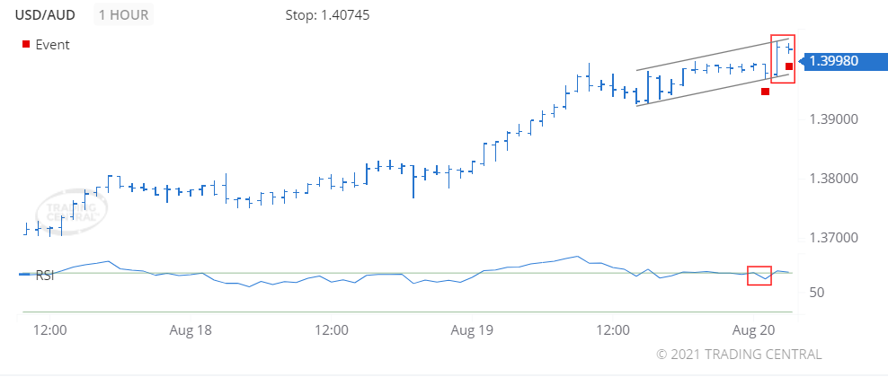 The RSI fallen below 70 on 2021 Aug 20 at 01:00 GMT, telling us the price is starting to pull back from being overbought.