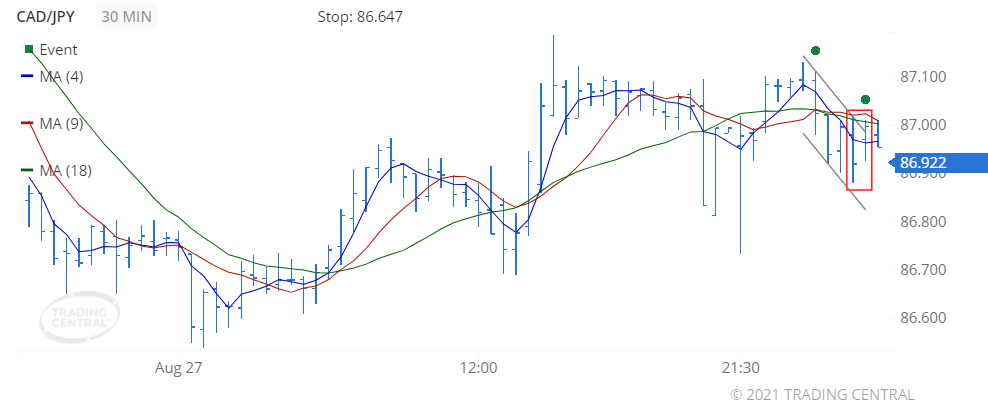 We found a pattern called Inside Bar (Bullish) on 2021 Aug 30 at 02:30 GMT on a 30 minute chart suggesting the outlook is bullish for up to 12 hours.