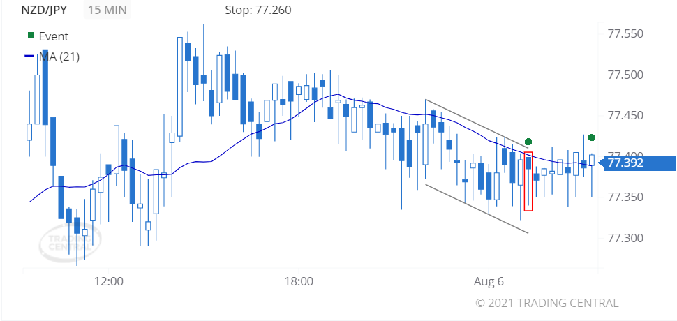+0.007 (0.7 pips) price change since the Technical Event at 77.385
