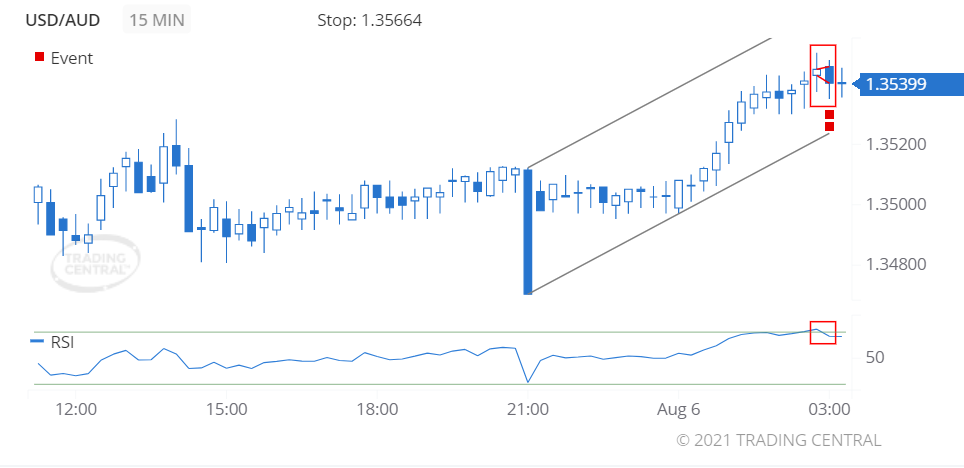 The RSI fallen below 70 on 2021 Aug 06 at 03:00 GMT, telling us the price is starting to pull back from being overbought.