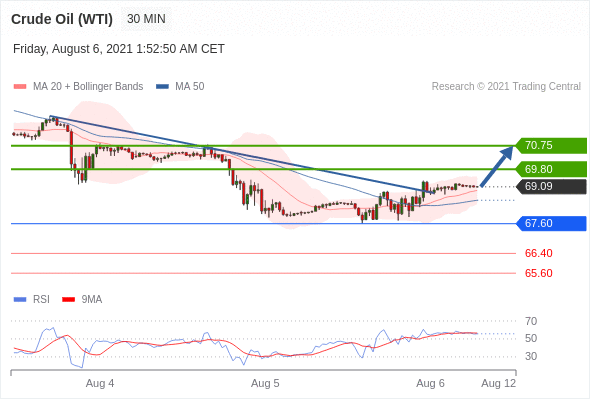 Long positions above 67.60 with targets at 69.80 & 70.75 in extension.