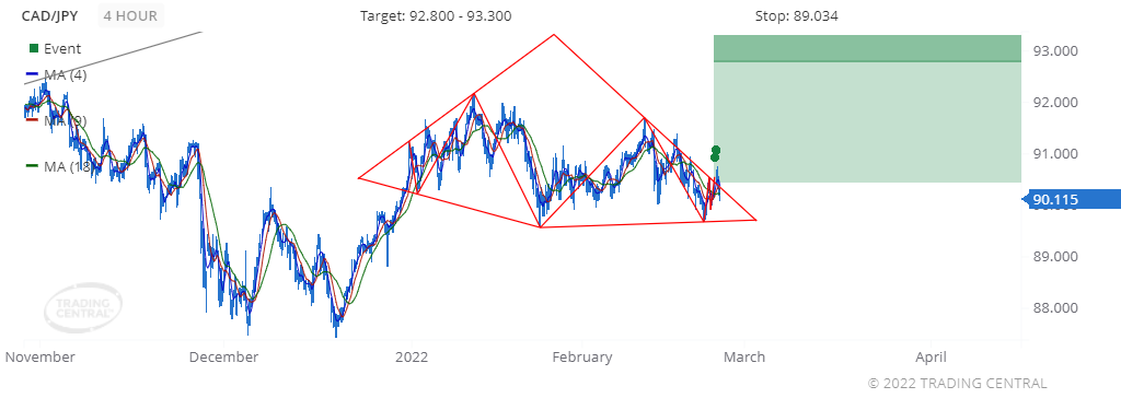 We found a pattern called Continuation Diamond (Bullish) on 2022 Feb 23 at 09:00 GMT on a 4 hour chart, providing a target price for up to 2 weeks in the range of 92.800 to 93.300.