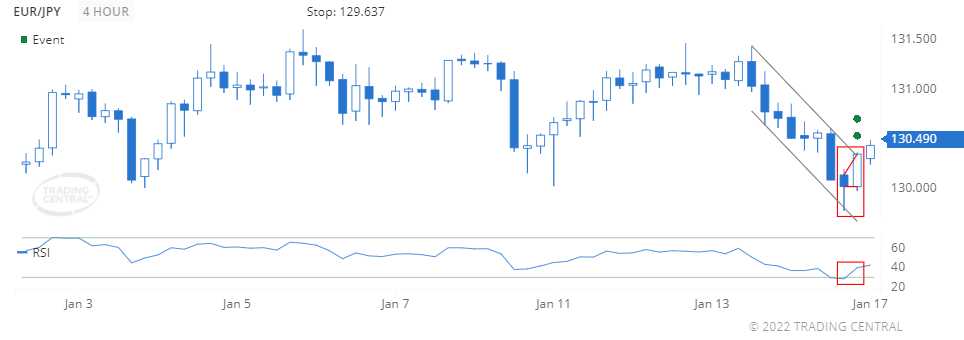 The RSI rose above 30 on 2022 Jan 14 at 21:00 GMT, telling us the price is starting to recover from being oversold.