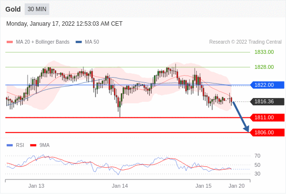 Short positions below 1822.00 with targets at 1811.00 & 1806.00 in extension.