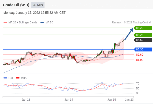 We found a pattern called Flag (Bullish) on 2022 Jan 14 at 19:00 GMT on a 30 minute chart, providing a target price for up to 12 hours in the range of 82.560 to 82.640.