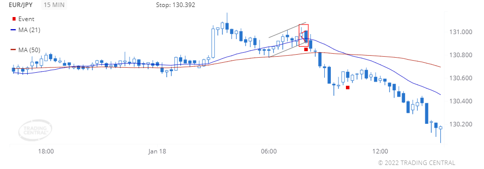 We found a pattern called Engulfing Line (Bearish) on 2022 Jan 18 at 08:00 GMT on a 15 minute chart suggesting the outlook is bearish for up to 12 hours.