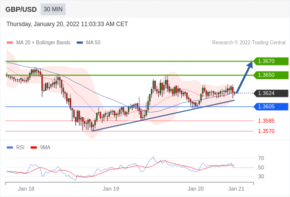 Long positions above 1.3605 with targets at 1.3650 & 1.3670 in extension.