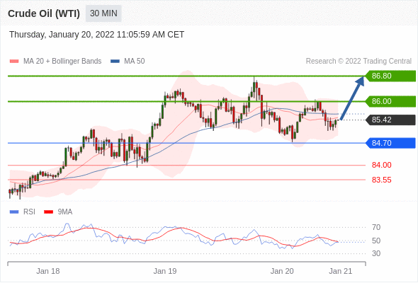 Long positions above 84.70 with targets at 86.00 & 86.80 in extension.