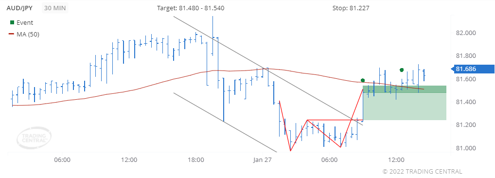 We found a pattern called Double Bottom on 2022 Jan 27 at 09:00 GMT on a 30 minute chart, providing a target price for up to 48 hours in the range of 81.480 to 81.540.